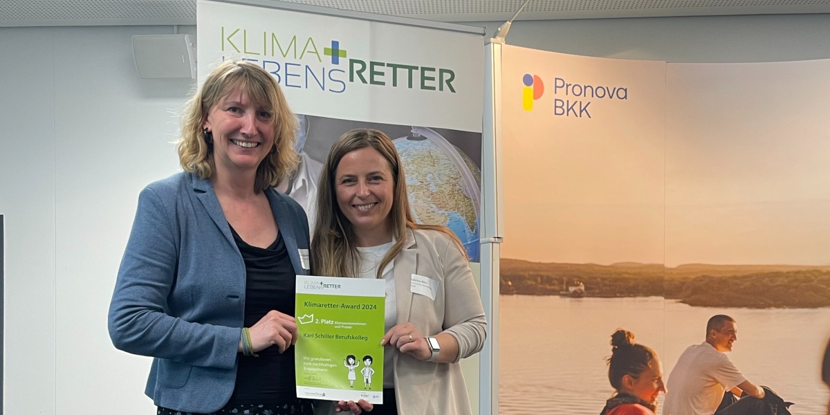 Am 11.6. durften Frau Jaschkowitz und Frau Bliss in Leverkusen im Hause der Pronova BKK die Urkunde für das Engagement der Abschlussklassen ZF121 und MF521 entgegennehmen. Der Klimaretter-Award würdigt Unternehmen und Beschäftigte im Gesundheitswesen für ihren Einsatz im Klimaschutz.