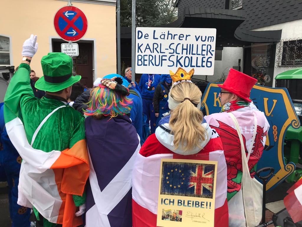 Als Karnevalsgruppe hatten die Lehrer und Lehrerinnen des Karl-Schiller-Berufskollegs sich für eine Verkleidung als "vereintes Europa" entschieden. In verschiedene europäische Flaggen-Ponchos gehüllt und entsprechend bemalt ging es los. Schließlich ist das Karl-Schiller-Berufskolleg Europaschule und pflegt zahlreiche Kontakte zu europäischen Ländern. Mehrere Einkaufswagen mit Kamelle mussten in Tüten verpackt und auf Bollerwagen verteilt und ein Schild selber gemalt werden. Und dann ging´s los...